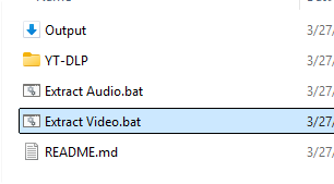 ๐ Download Youtube Video โโโ ๐ Output โ downloaded files go here โโโ ๐ YT-DLP โ program files โ โโโ ffmpeg.exe โ โโโ yt-dlp.exe โโโ Extract Video.bat (open this to extract the video) โโโ Extract Audio.bat (open this to extract the audio) โโโ README.md